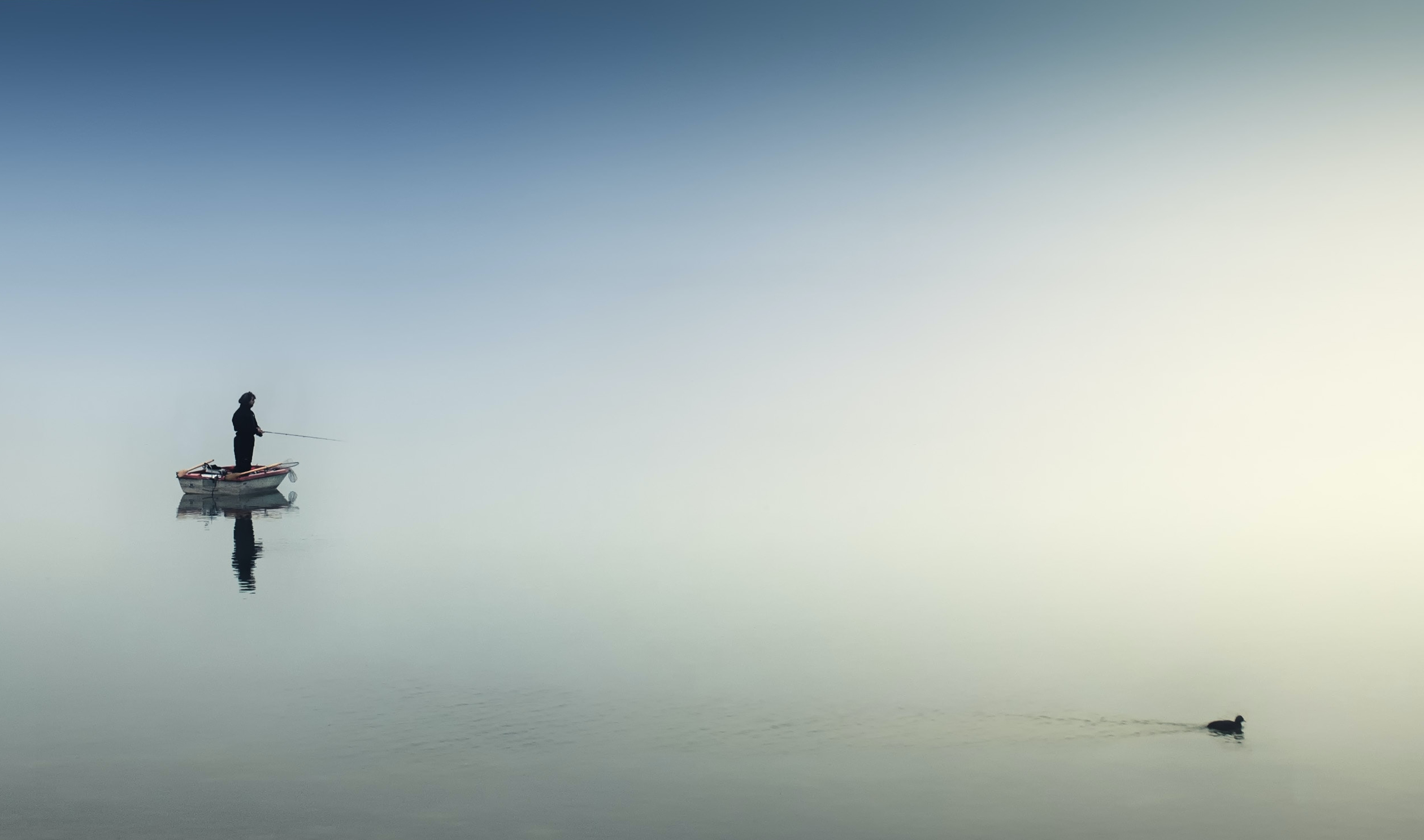 王对着水里摸摸自己的头发,水里人也就摸摸头发。打了自己一巴掌,水里的人犹豫了一下,也打了自己一巴掌。唏嘘怪哉,起皮疙瘩都起了,取来渔网,往水里一撒,这倒影还真被网住了,这怪人愣了一愣,怪模怪样地挣扎起来,那力道有如最肥时节的青鱼。拉扯着收网也不是,捞上来又不能活杀了下酒,干脆放了也不是。犹犹豫豫之间,小舟颠荡得越加猛烈,弹指间,哗地翻了个底朝天。